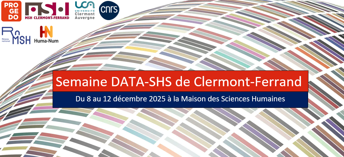 La Maison des sciences humaines (MSH) de Clermont-Ferrand, à laquelle notre laboratoire est associé, organise chaque année une semaine de conférences et de formations sur les données sous l'égide de PROGEDO. L'édition 2025 se déroule du lundi 8 décembre au vendredi 12 décembre dans les locaux de la MSH. Les activités proposées permettent aux chercheurs·ses, ingénieur·e·s, doctorant·e·s et étudiant·e·s des laboratoires associés de se former aux enjeux de la gestion et l'analyse des données.